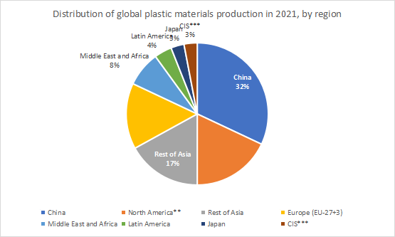 据ITC数据2022年统计,前五大塑料生产及出口国分别是中国、美国、德国、韩国和比利时。根据statista数据,2021年度全球塑料总产量为3.907亿公吨,其中,中国的塑料材料生产占据全球32%的份额,成为迄今为止全球最大的塑料生产国。同年,北美地区是第二大塑料生产地区,占据全球产量的近20%。